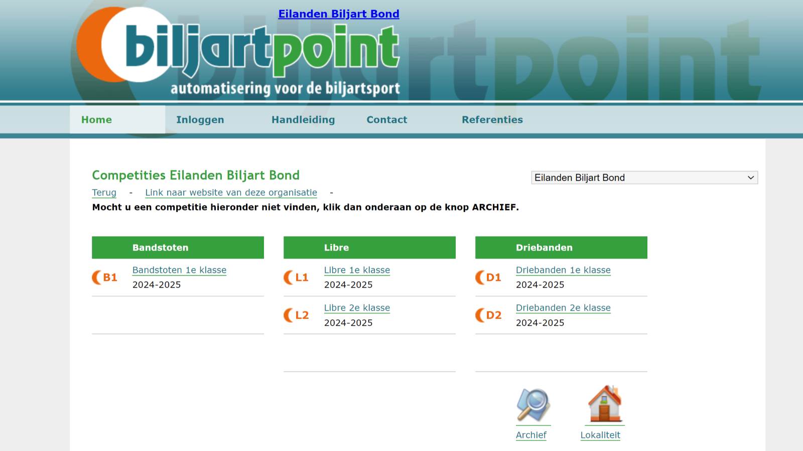 Lees meerWelkom op de vernieuwde website van de Eilanden Biljart Bond. We hebben de site een volledig nieuwe layout gegeven. Er zijn ook dingen veranderd; zo kun je vanaf nu alle competities en uitslagen bekijken op BiljartPoint. Andere functies, zoals mededelingen en bewaarbiljarters, zijn nog steeds beschikbaar en vind je via het menu bovenaan de pagina.